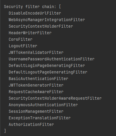 필터를 디버깅하는 방법에 관해서 알아보자. 첫 번째 디버깅에 관해서 추천하는 방법은 프로젝트 메인 클래스 위에 @EnableWebSecurity(debug = true)를 설정하는 것이다. 설정을 해놓았다면 어플리케이션을 띄울 때 다음처럼 메시지가 뜰 것이다.