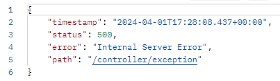 위의 코드를 포스트맨을 통해서 작동시켜보면 아래와 같이 에러가 뜰 것이다. 분명히 아무런 작업을 해주지 않았는데, 스프링 내의 무언가가 이렇게 응답에서 에러와 일어난 경로 등을 표현해서 찍어내고 있다. 이것은 누가한 행동인지에 관해서 한 번 알아보고, 예전에 필터를 설정해놓은게 있었는데 어떻게 못하나에 관해서도 알아볼 예정이다. 마지막으로 컨트롤러 예외처리를 어떻게 하면 좋을지 찾은 내용을 공유하고 마치려고 한다.