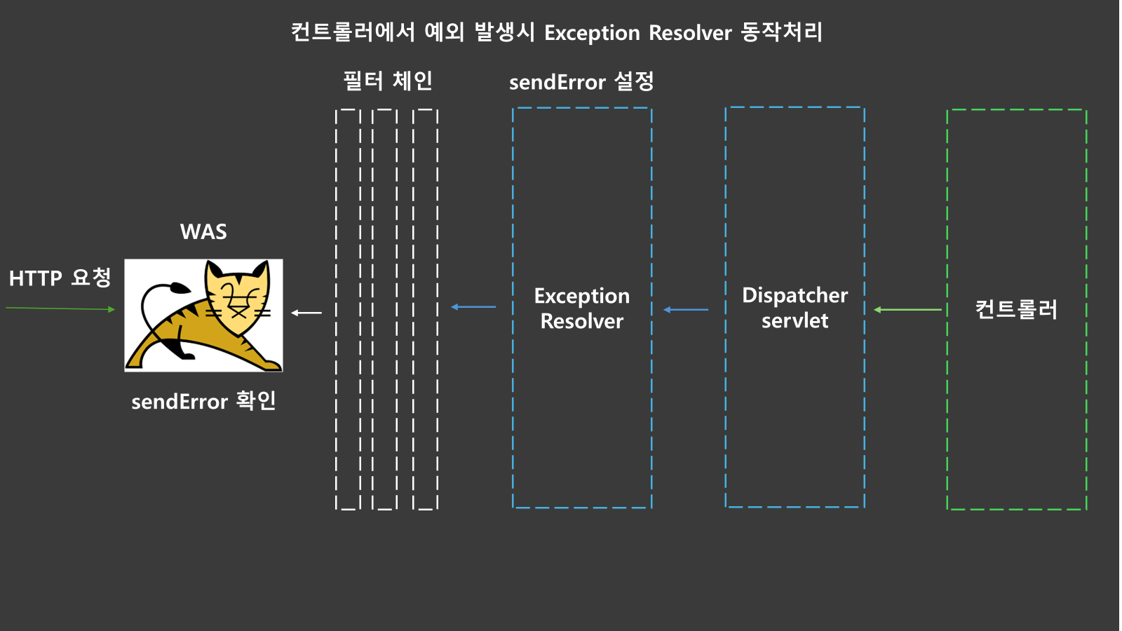 이를 위해서 스프링에서는 DispatcherServlet 단에서 ExceptionResolver라는 것을 제공해서 컨트롤러에서 발생한 예외를 인터셉터를 건너뛰고 DispatcherServlet으로 넘어가서 등록한 Exception Resolver를 호출해 컨트롤러 단에서 발생한 예외를 잡아 sendError로 표시만 해놓고 WAS로 요청을 넘기는 방식으로 처리한다.