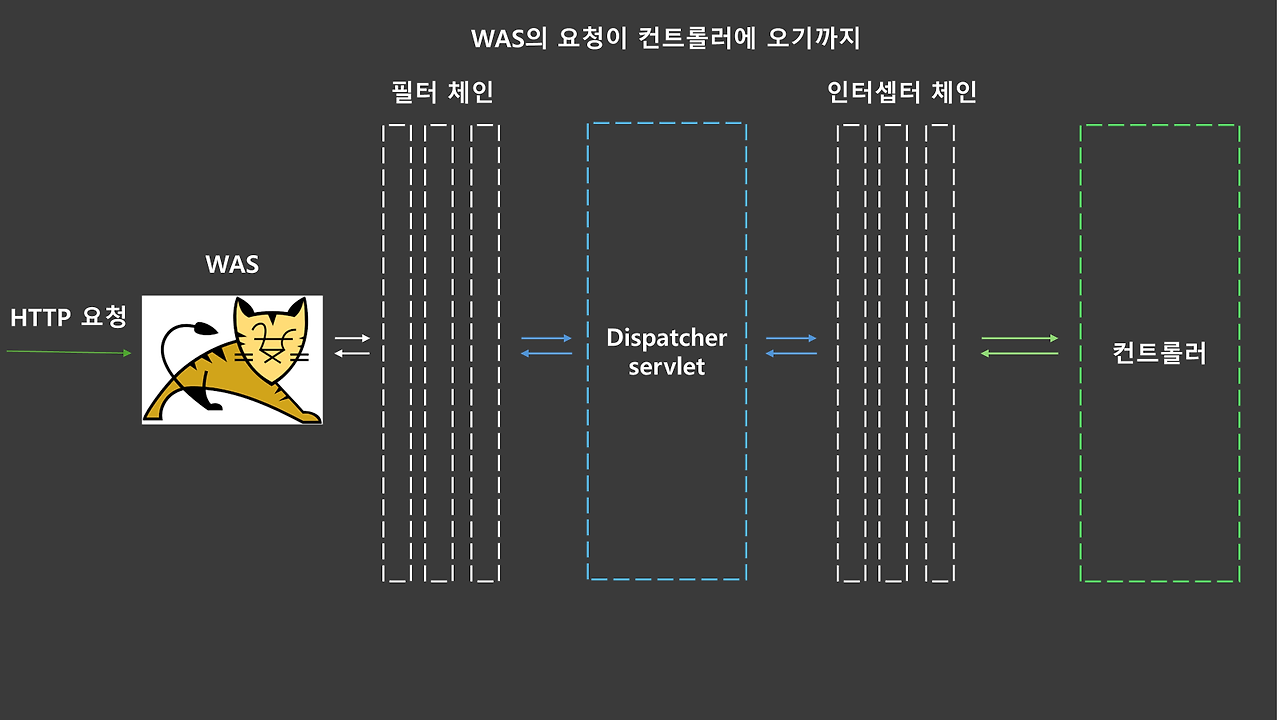1편에서 보였던 이미지를 자세히 보면 WAS에서 컨트롤러까지 단방향으로 흐르는게 아니라 양방향으로 흐르고 있다. 이렇게 그림을 그린 이유는 WAS에서 컨트롤러로 간 요청은 응답을 처리하고 WAS까지 다시 간다. 그리고 그 과정에서 기존에 필터, 서블릿, 인터셉터 순으로 들렀던 걸 반대로 인터셉터, 서블릿, 필터 순으로 방문하며 다시 간다.
