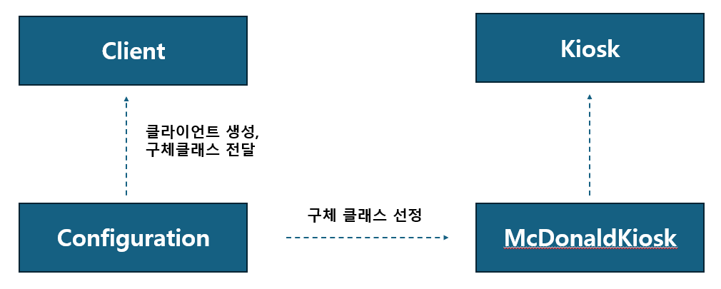 이 문제를 해결할 수 있는 방법은 키오스크를 추상화시켜서 외부에서 클라이언트를 생성하고 구체화된 키오스크를 생성해 클라이언트에게 전달하는 방법이다.