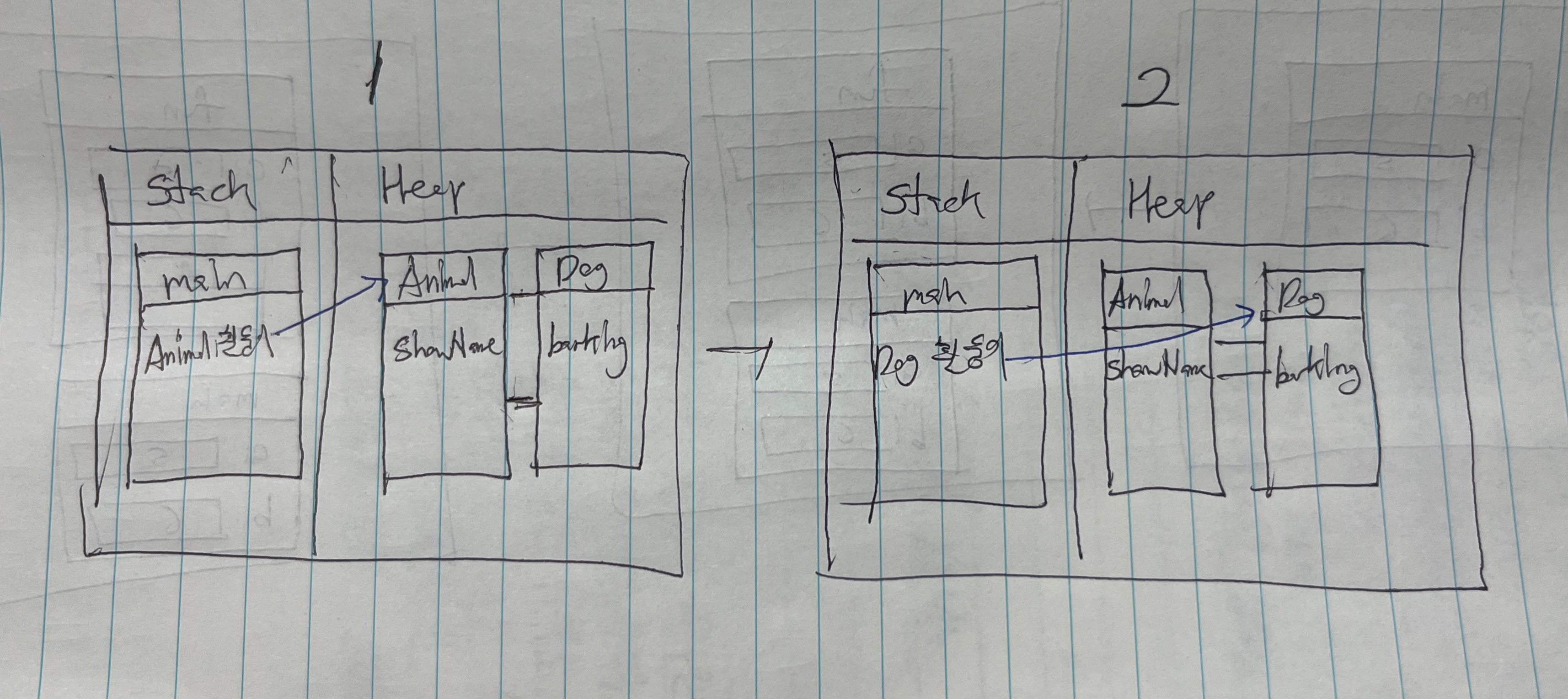 ((Dog) 흰둥이).barking(); // 2 형변환하면 포인터가 바뀌면서 된다.
